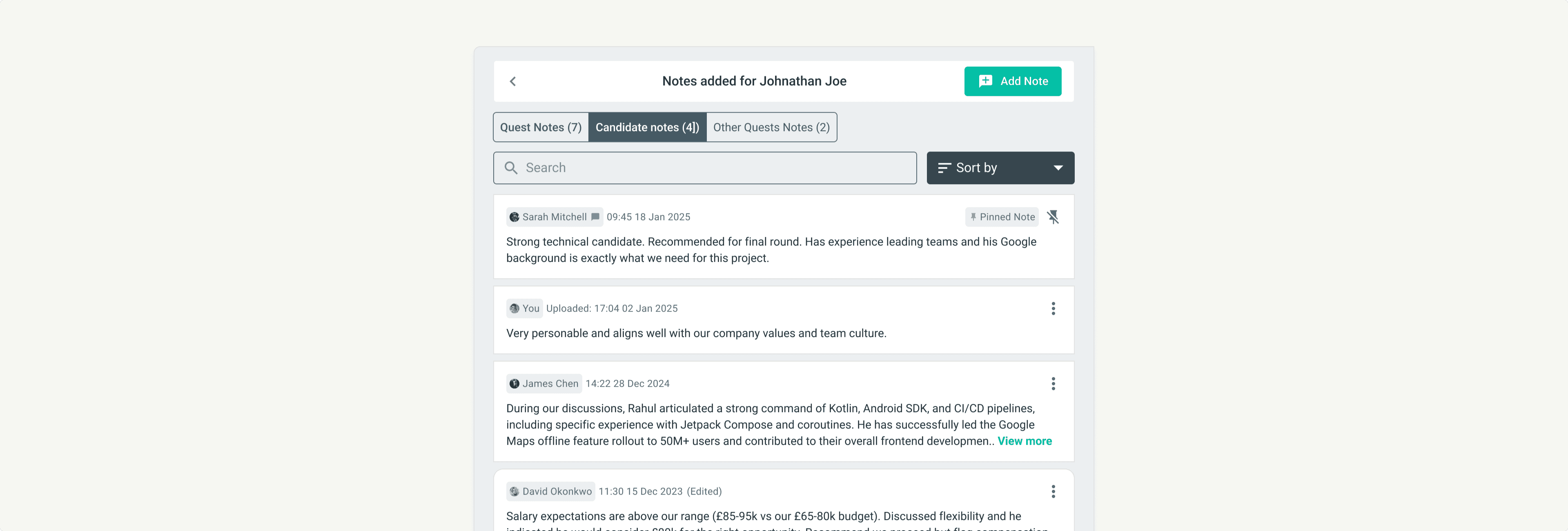 Candidate Notes. Context that follows the candidate across any Quest. "Great communicator. Interviewed well for the London role last quarter."
