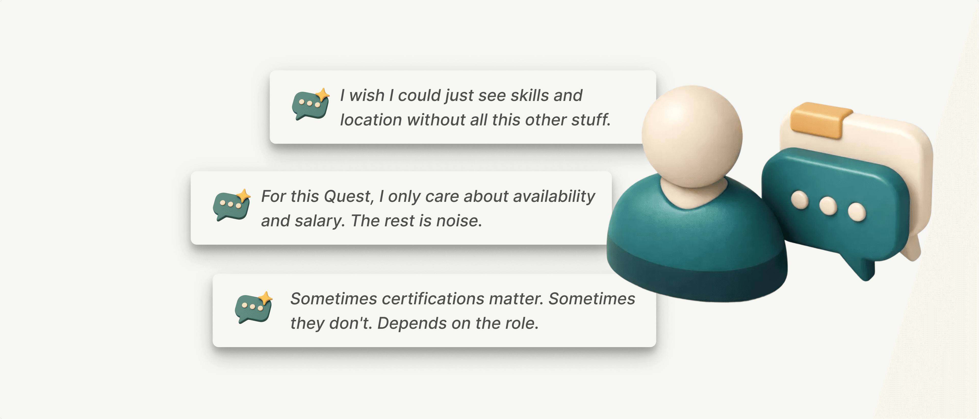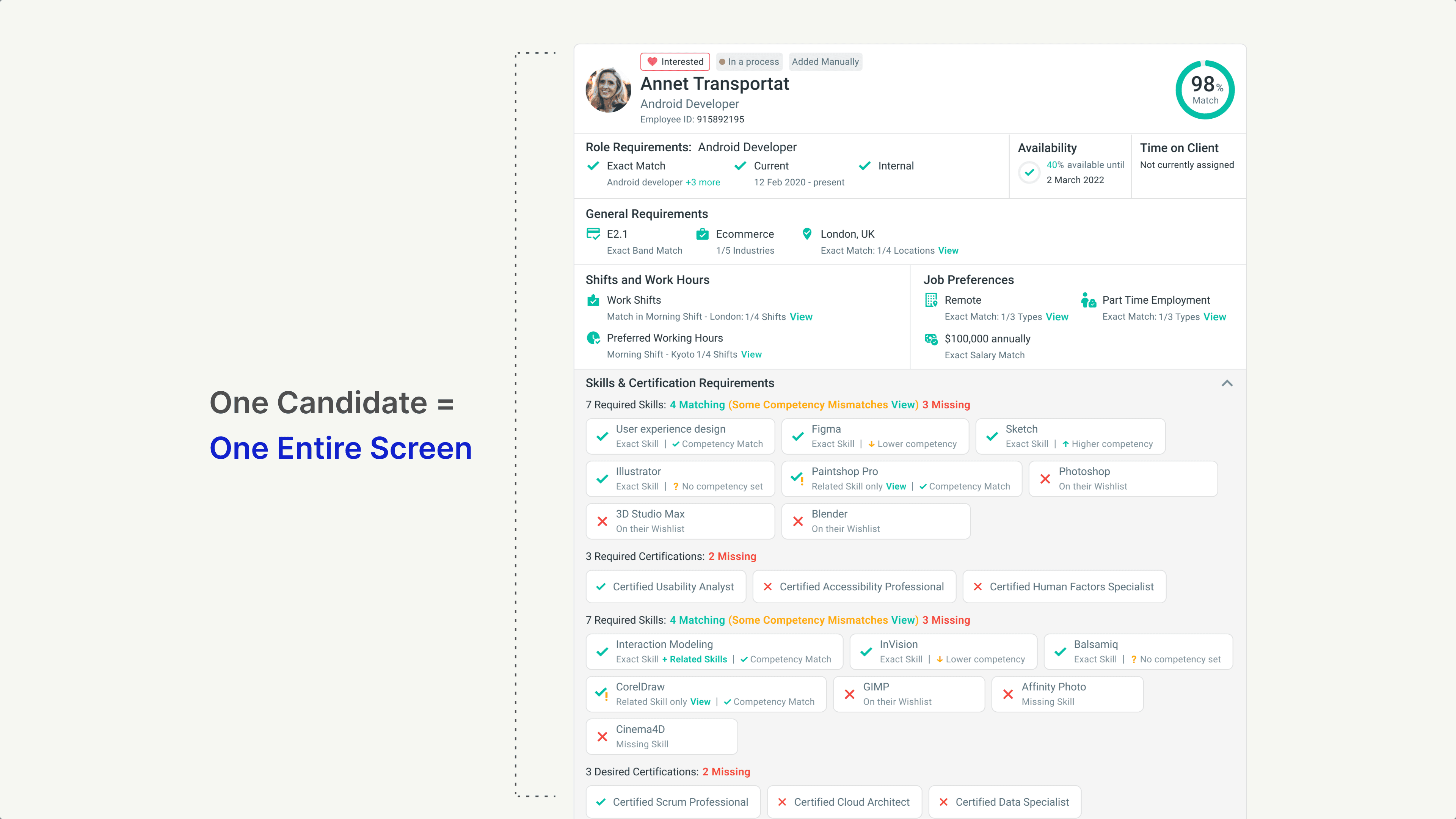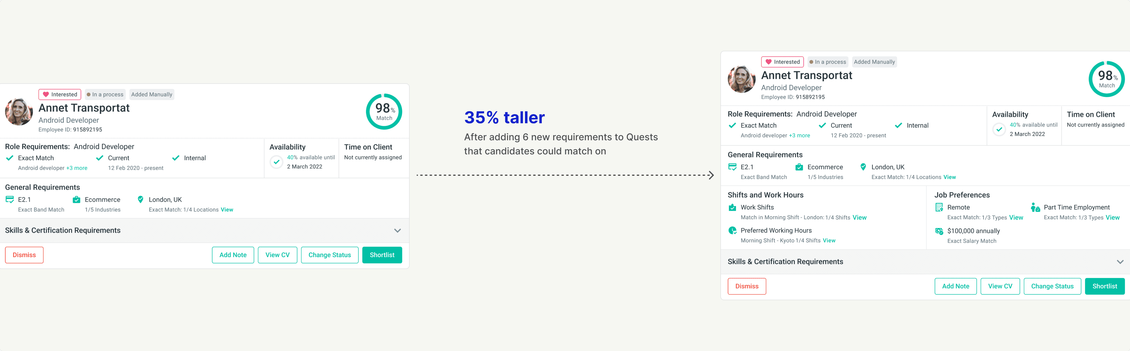 When a Quest had a handful of requirements (role title, band level, location) the card was compact and scannable. You could see 3-4 candidates on screen at once. It worked.
