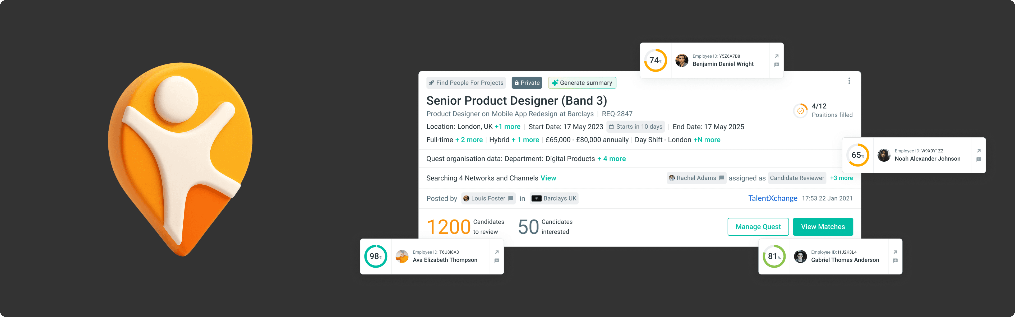 For each Quest, the system generates a list of matched candidates, scored on how well they fit the role's requirements: skills, certifications, band level, location, salary, availability, and more.