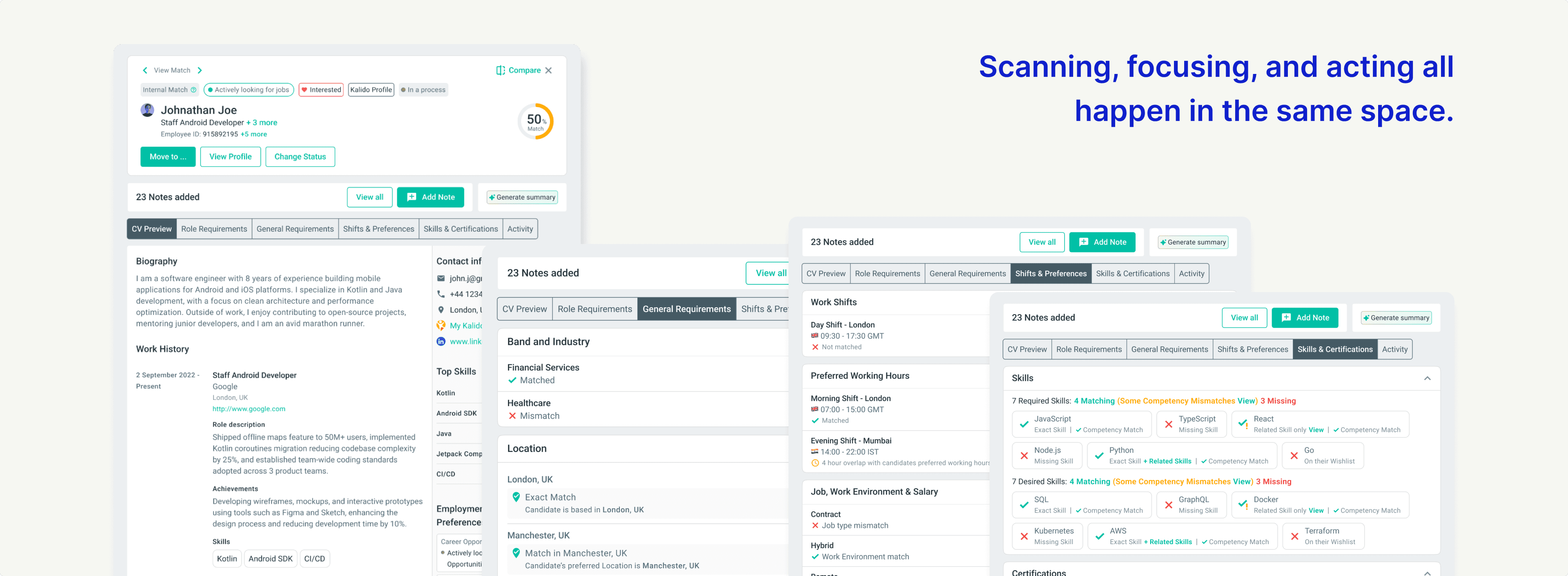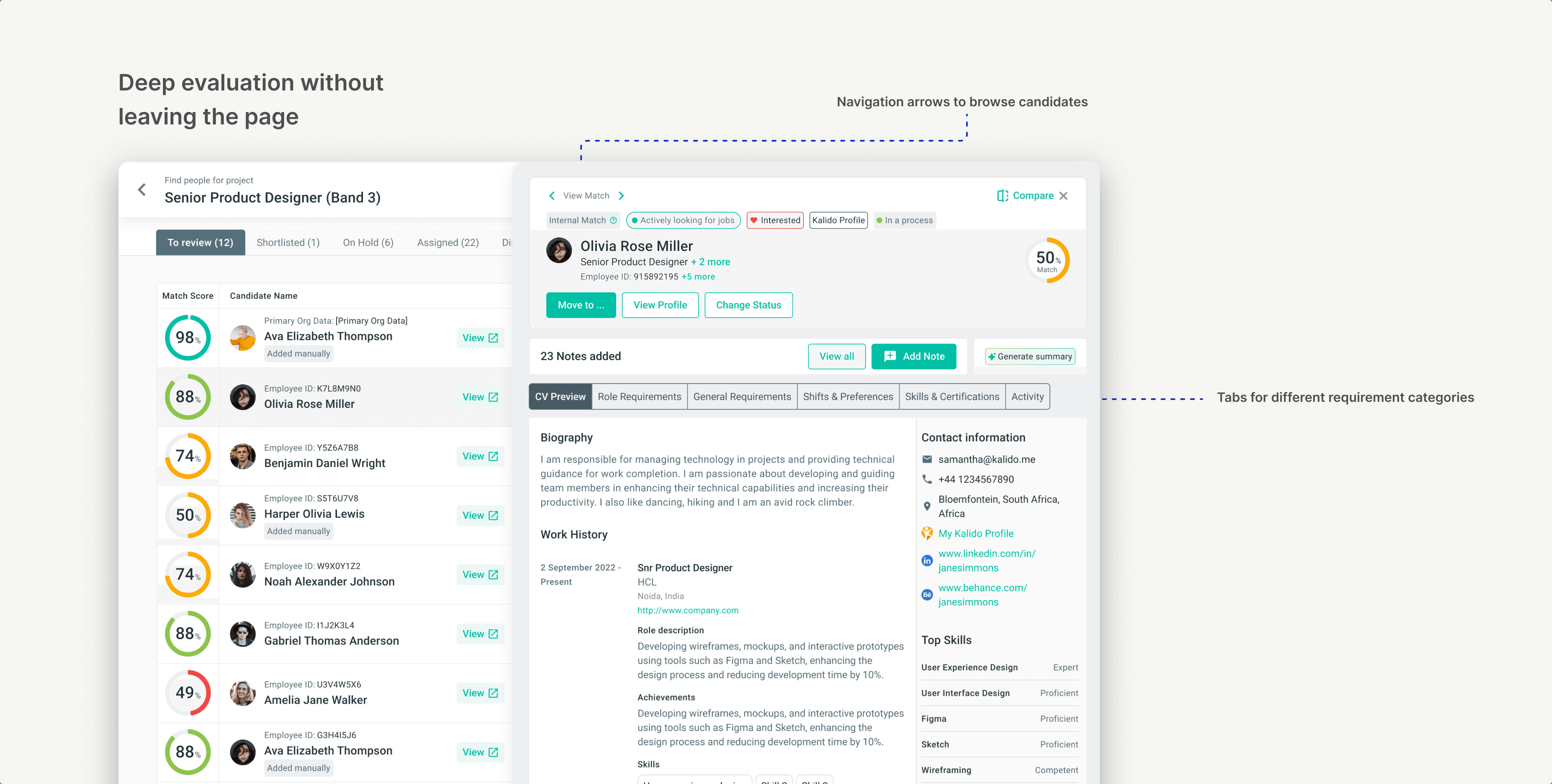 Scrollable columns on the right: All requirements and candidate details live here. Role match, band, location, skills, certifications, salary, shifts, job preferences. Scroll to see what you need.
