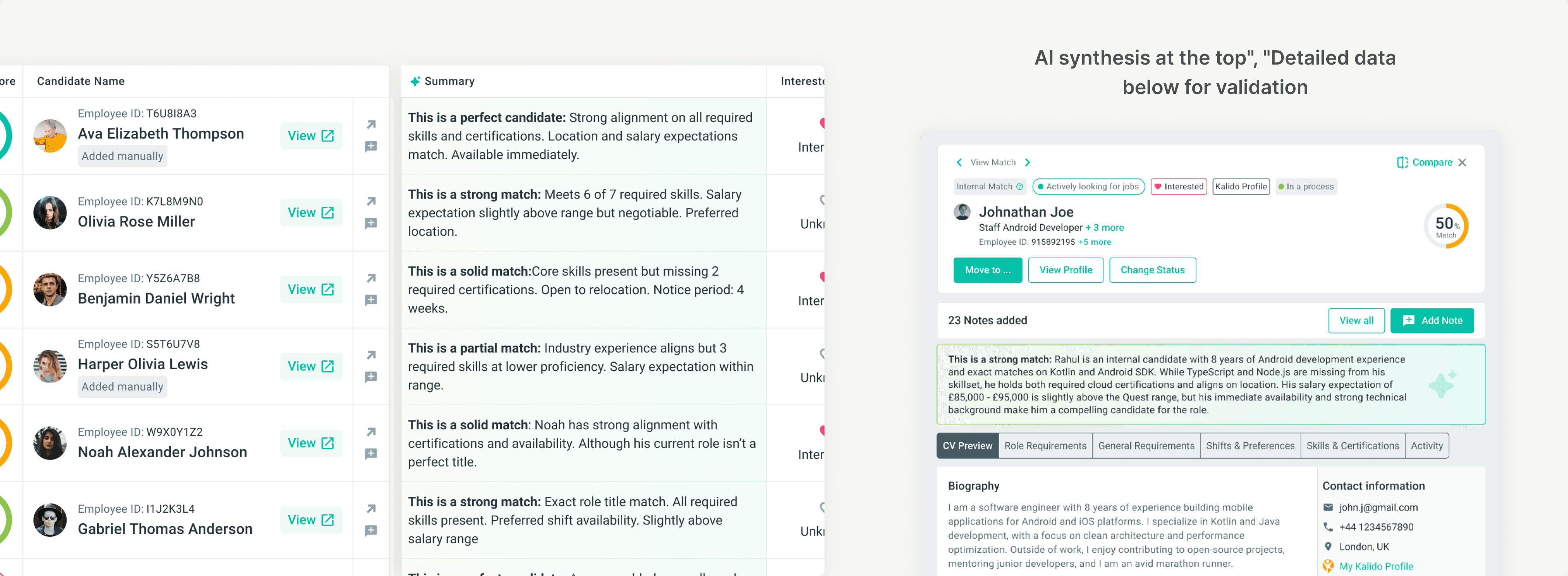A recruiter scanning 30 candidates can quickly spot which ones are worth a deeper look. The "partial match" candidates might get dismissed faster. The "perfect candidate" summaries earn a Full View click.
