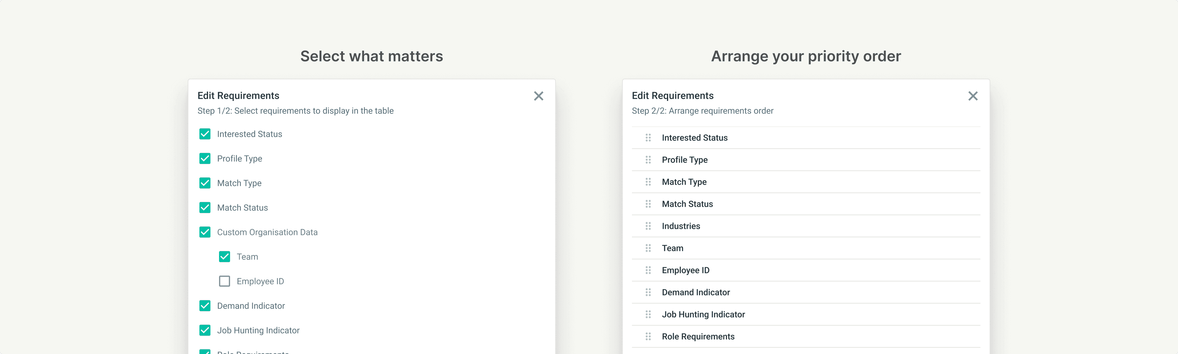 Remember the core insight? Every recruiter prioritizes different requirements depending on the role. A fixed table layout would repeat the same mistake as the fixed card layout.