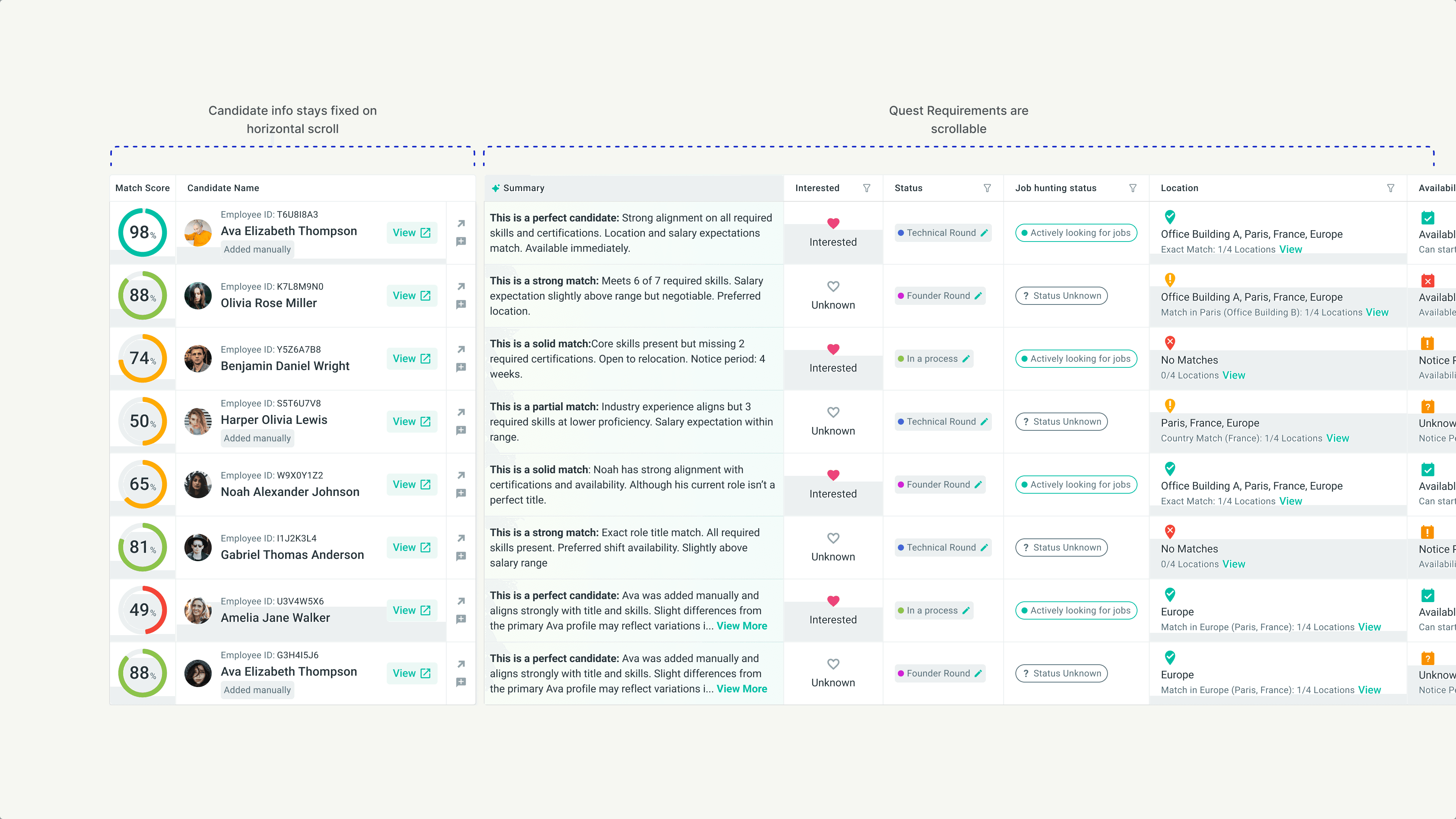 Fixed columns on the left: Match score and candidate name always stay visible. No matter how far you scroll horizontally, you never lose track of who you're looking at.