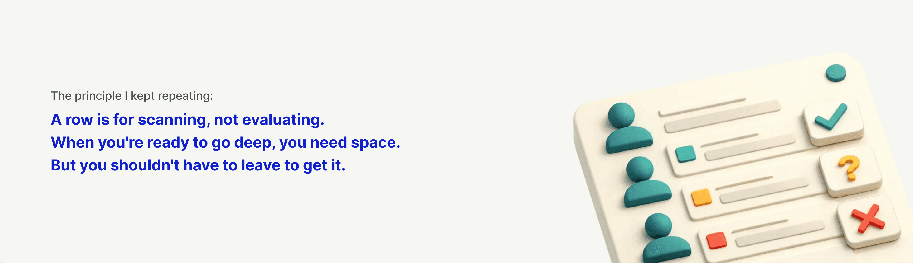 1. Watch what users do, not just what they say. Recruiters never asked for a table. They asked for "a better card" or "faster loading." But their behavior told the real story: exporting to CSV, screenshotting into PowerPoint, building comparison views elsewhere. The workarounds revealed the actual need.