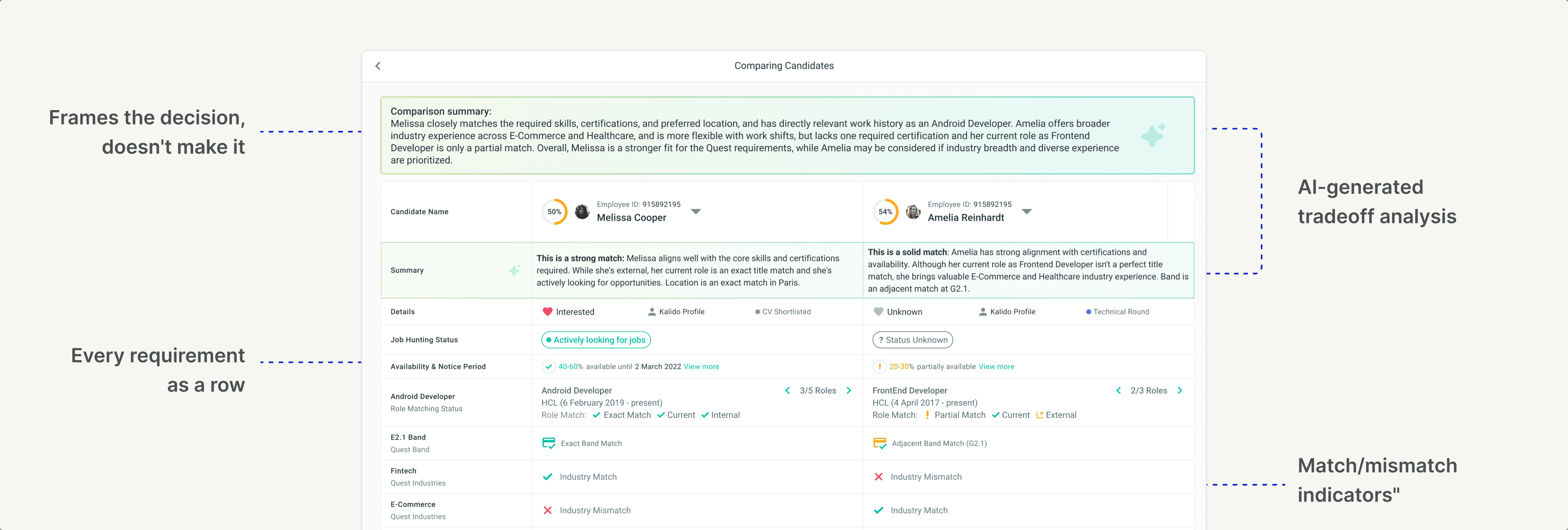 Decide. Choosing between two strong candidates? Compare them side-by-side, requirement by requirement, with AI-generated summaries that call out the differences.