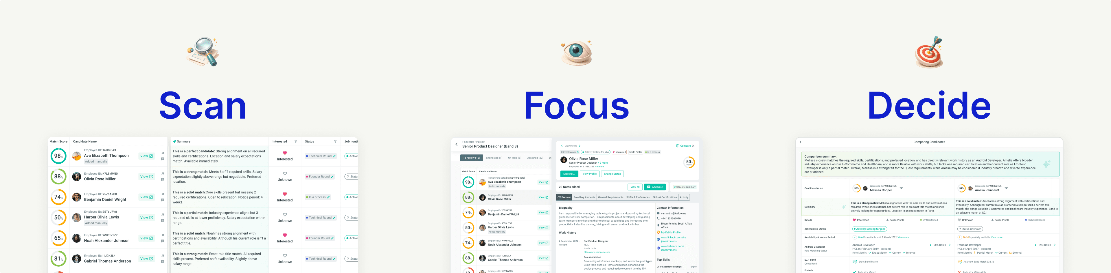 Seeing multiple candidates at once was impossible. Comparing candidates on a specific requirement meant scrolling, remembering, scrolling back, and forgetting.