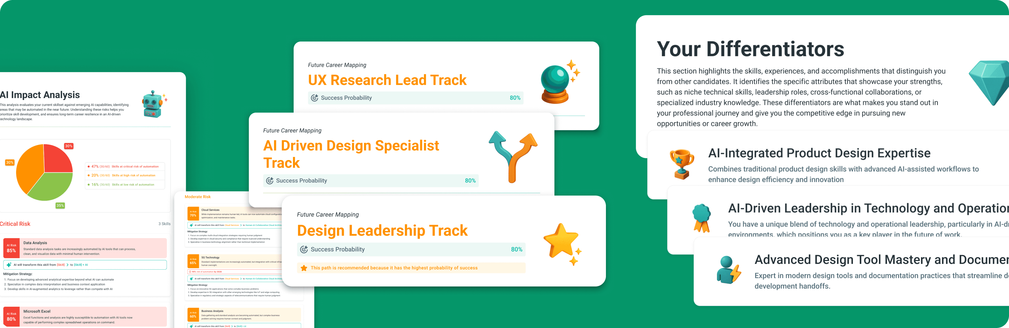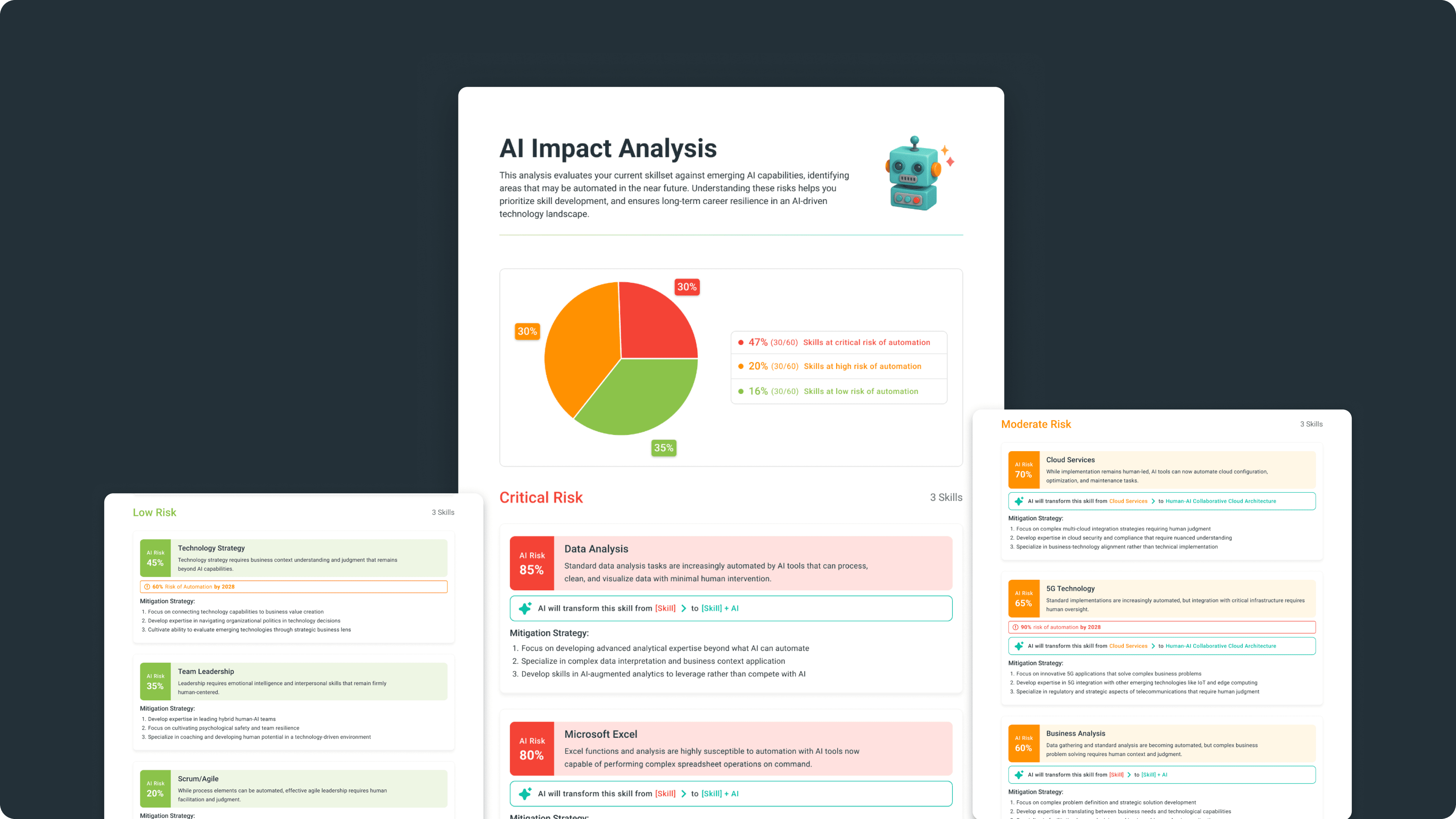 Shifted from "X% of your skills at risk" to "Here's how your skills will transform." Paired every risk with specific evolution strategies.