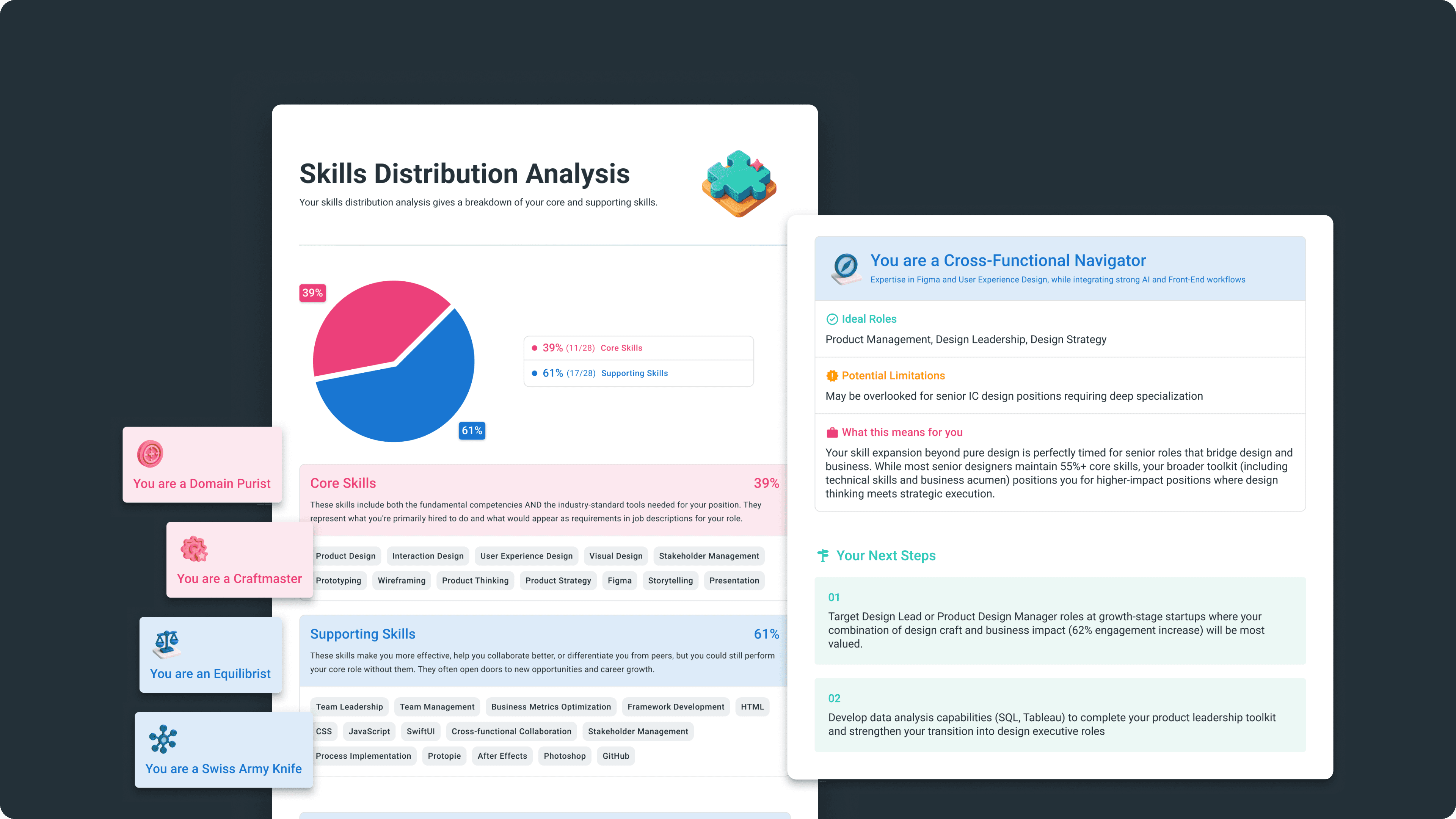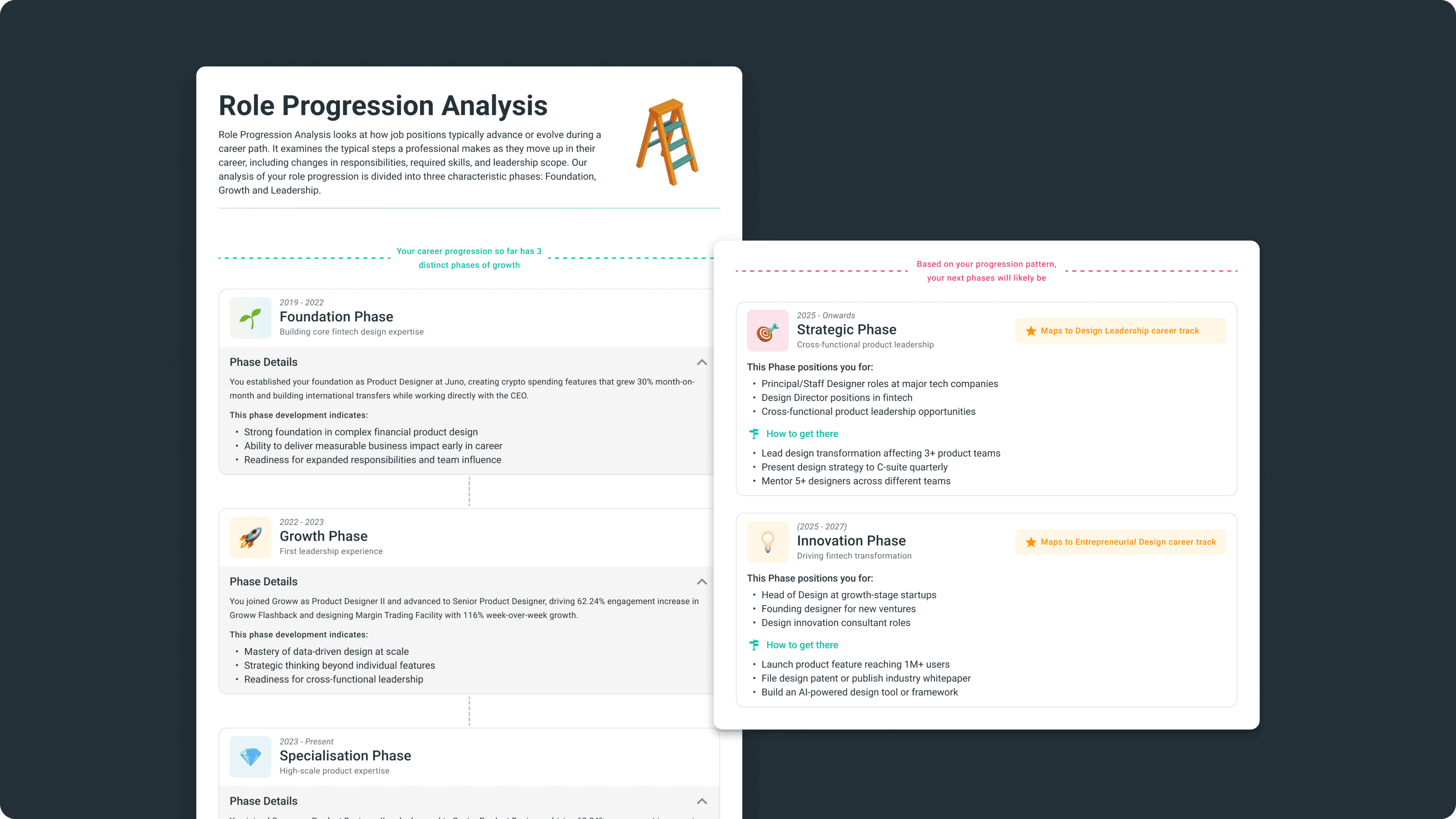 These sections best illustrate the design challenges we faced—transforming dense career data into actionable, personalized insights.